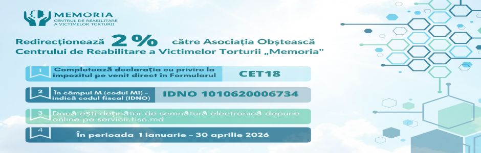 Centrul de Reabilitare a Victimelor Torturii „Memoria” este unicul centru din Moldova care oferă ajutor, informaţie şi sprijin victimelor torturii, victimelor violenţei în familie şi violenţei sexuale, precum şi refugiaţilor şi solicitanţilor de azil. Noi ajutăm persoanele care au suferit de violenţă în orice moment al vieţii lor. Asistenţa calificată este oferită de o echipă multidisciplinară de profesionişti - psihologi, medici, asistenți sociali şi avocaţi.